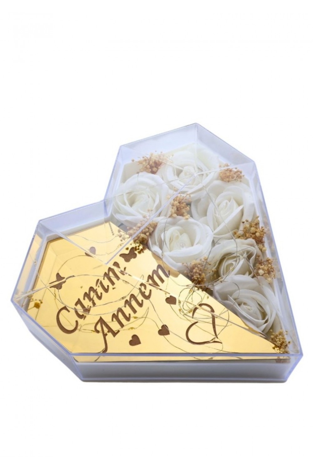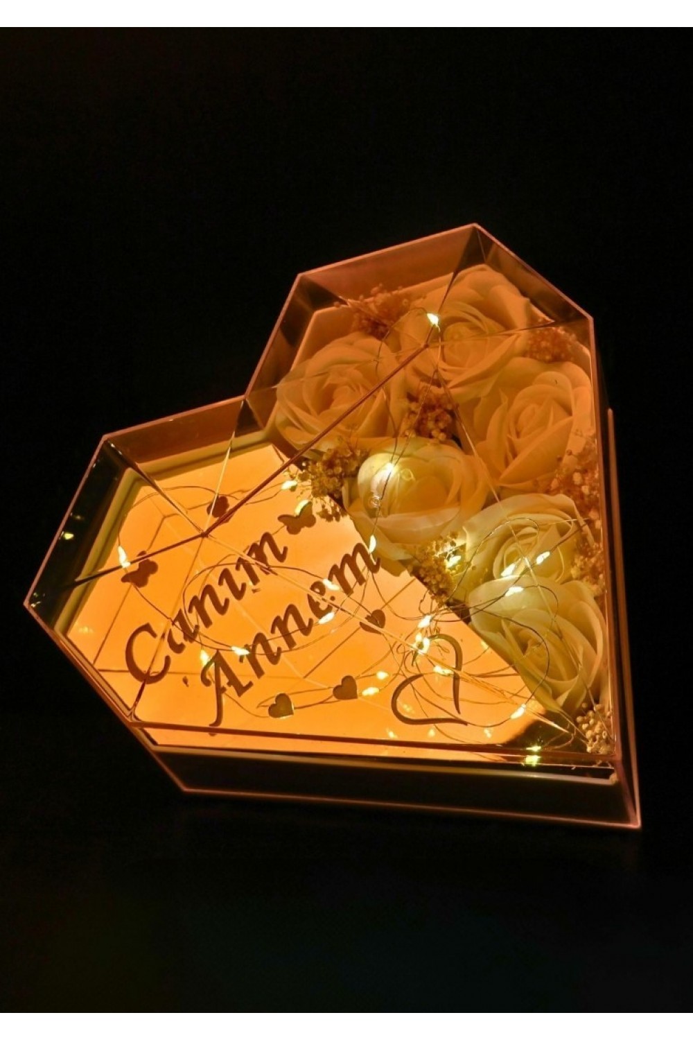 ''Canım Annem'' Yazılı Annelere Özel Işıklı Kelebekli Kalpli Kutu