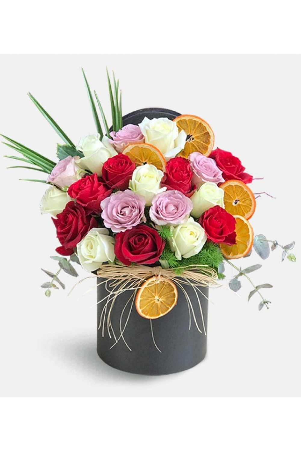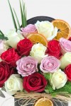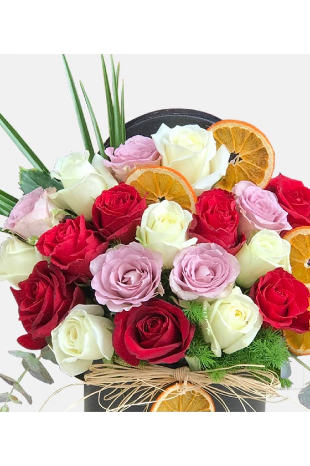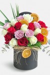 Yuvarlak kutuda çeşitli gül renkleri ile hazırlanan renkli gül aranjmanı